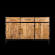 Mooi strak egaal mango houten sideboard wat qua formaat in vele woonkamers past.Het staal is zwart ge-poedercoat en het hout met blanke...